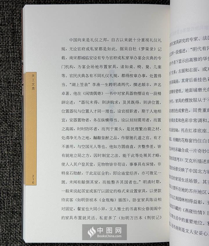 《天工文质:明式家具美器之道说略》:明式家具入门读物,以明清文化和社会经济史为背景,以出土古迹文物、各大博物馆藏品以及业界认知度较高的家具为经典案例,力求从文化社会经济发展的视角去研究和解读明式家具。